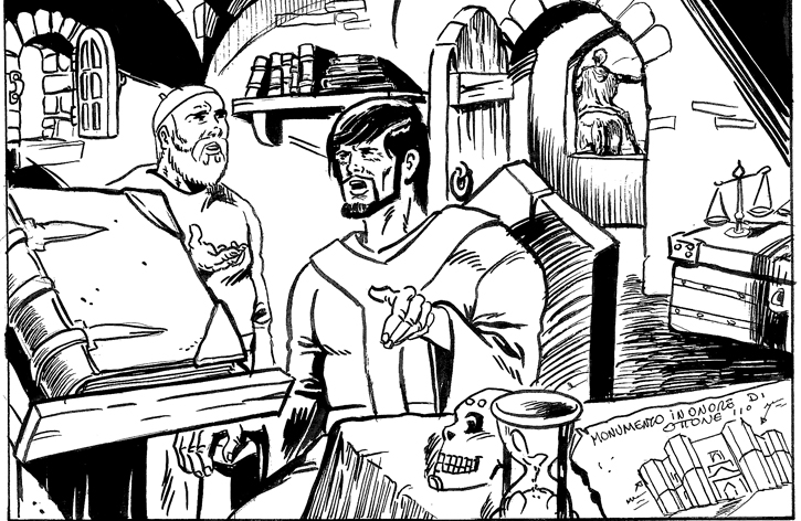 di Gerberto ormai papa, sopra al suo tavolo insieme a una clessidra e al golem[1], una pergamena con su schizzato un monumento